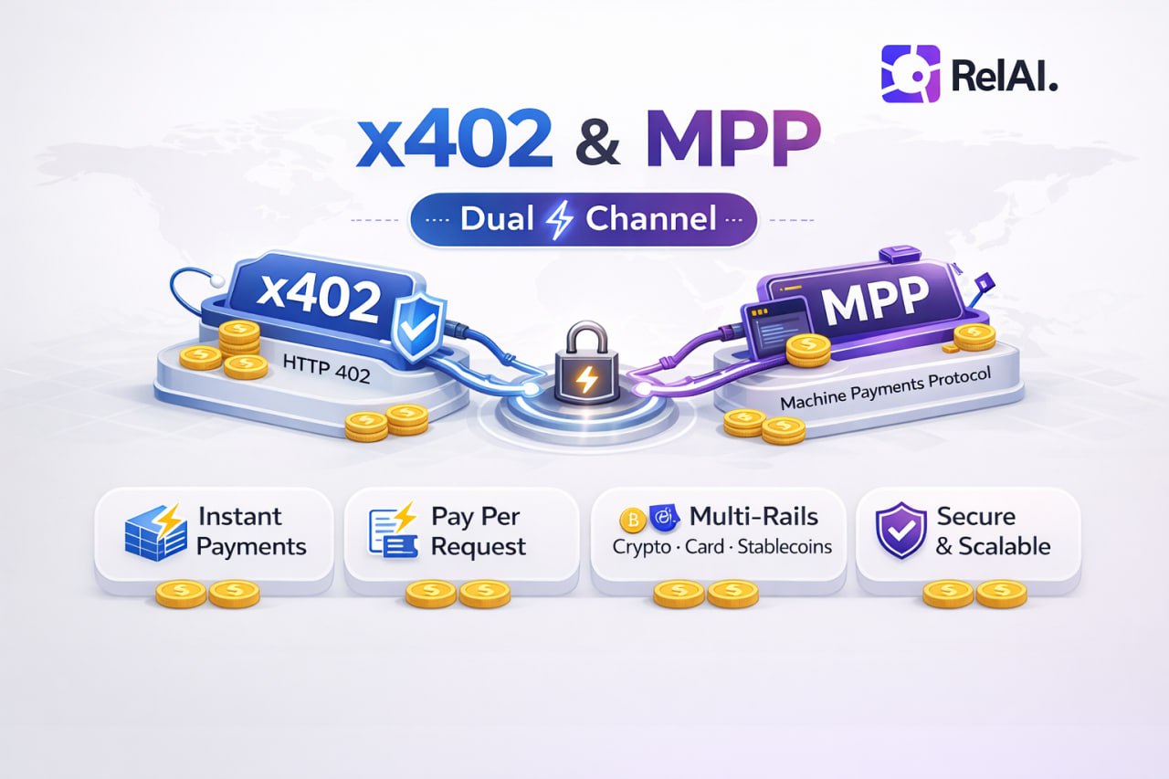 The @relai-fi/x402 SDK now supports Dual-Channel payments — x402 and MPP (Machine Payment Protocol) running through the same middleware. One protect() call, two payment rails, and every plugin works identically across both.