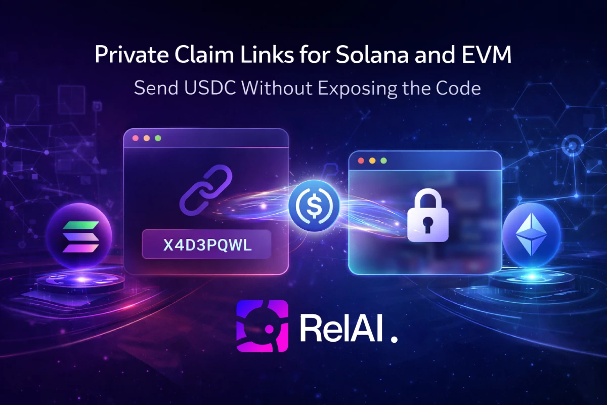 RelAI Payment Codes now support private claim links across Solana and EVM. Send USDC with a shareable link, keep the raw code hidden, and let recipients claim funds or reveal the code later.